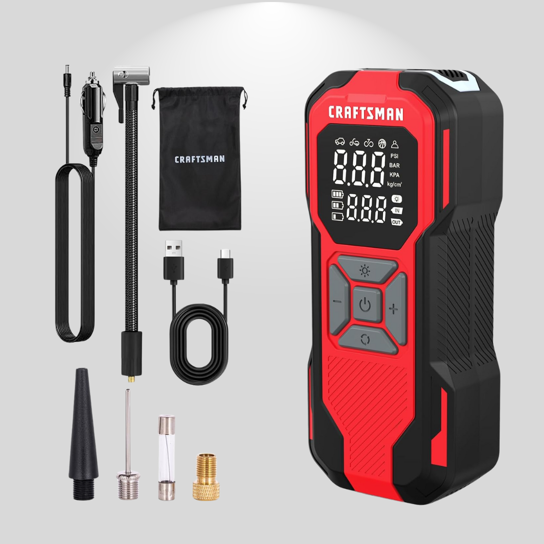- Portable Electric Air Pump – Weighing 1.28 lbs, cordless design, compact size, easy to store in the car and carry, road trip essentials. Additional car accessories include: Extra nozzle×3, Extra Fuse x1, USB Type C Charging Cord×1, 10ft Cigarette Lighter Cordx1